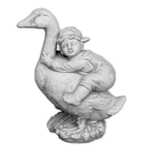 Figurka Chłopczyk na Gęsi przedstawia małego chłopca siedzącego na grzbiecie gęsi, co przywodzi na myśl opowieści z dziecięcych książek i świat wyobraźni pełen przygód. Ta urocza scena oddaje radość, ciekawość i odwagę dziecka odkrywającego świat z niezwykłej perspektywy. Figurka doskonale wpisuje się w ogrodowe otoczenie, wprowadzając do niego lekkość, ciepło i nieco bajkowego uroku.