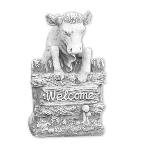 Figurka Welcome Krowa przedstawia urokliwą postać krowy, która opiera się o podpórkę, ukazując jedynie swoje przednie kopyta. Na podpórce widnieje napis „Welcome”, podkreślający zapraszający charakter dekoracji. Z wyraźnie oddanymi detalami sierści i łagodnym wyrazem twarzy, figurka emanuje ciepłem i przyjazną atmosferą. Wykonana z betonu w naturalnej szarości, łączy trwałość materiału z finezją formy, tworząc oryginalną ozdobę do ogrodu i przestrzeni zewnętrznej.
